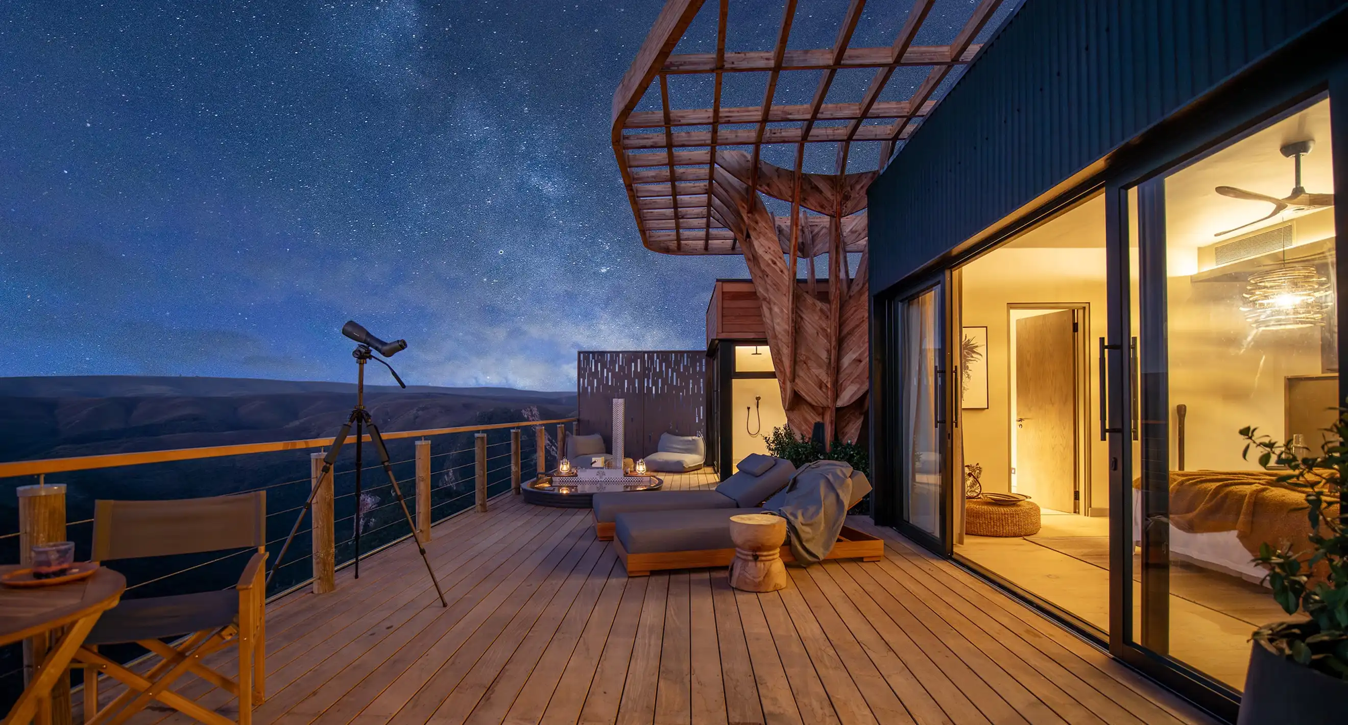 A stay at Hiddn is shaped by quiet luxuries. Fireplaces glow as evening falls, decks open to endless valleys, and intimate baths and infinity pools offer quiet moments beneath the stars. Natural textures and artisan-crafted details create a calm, welcoming atmosphere, connecting you to the land, the people, and the rhythm of the wilderness.