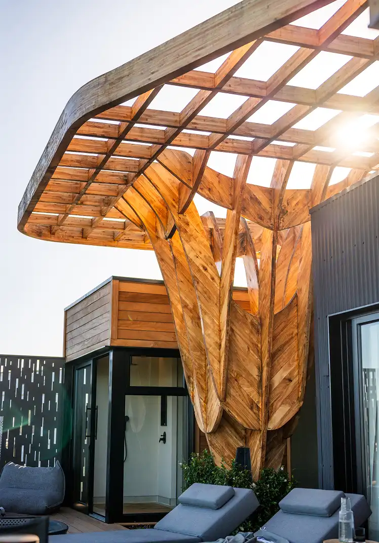 Curved timber structures echo the strength of the rhino, while hand-carved interiors tell stories of craft, heritage and soul.